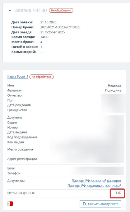 6. Если в бронировании несколько гостей, можно заполнить данные c помощью T-ID по каждому гостю. Для этого нужно нажать кнопку «Добавить гостя».