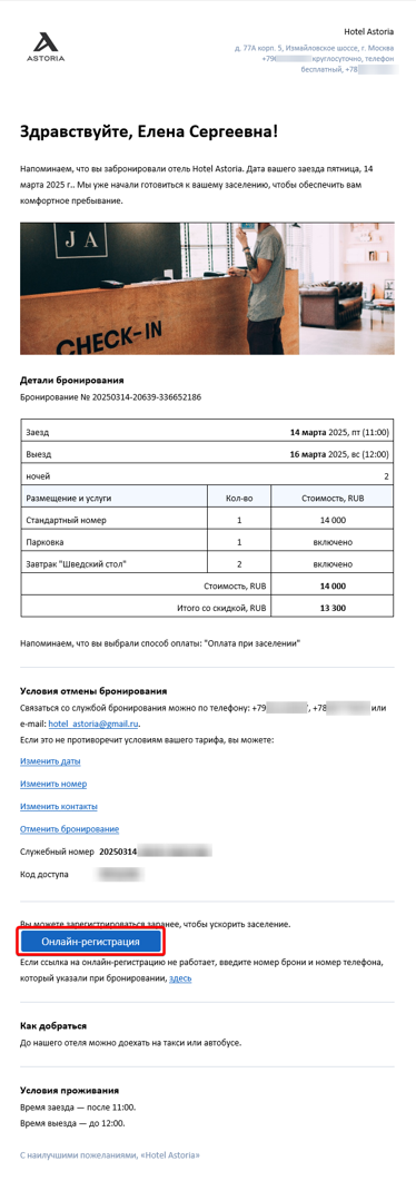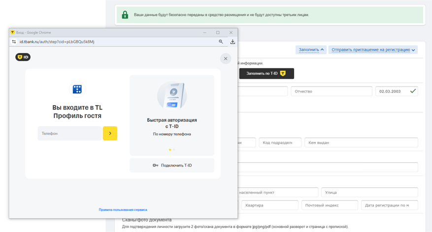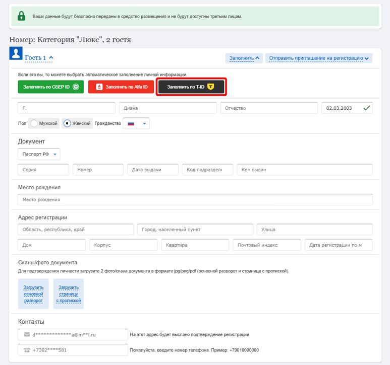 При прохождении онлайн-регистрации гость может автоматически заполнить свои данные с T-ID. Автозаполнение данных экономит время заполнения и снижает вероятность ошибок.