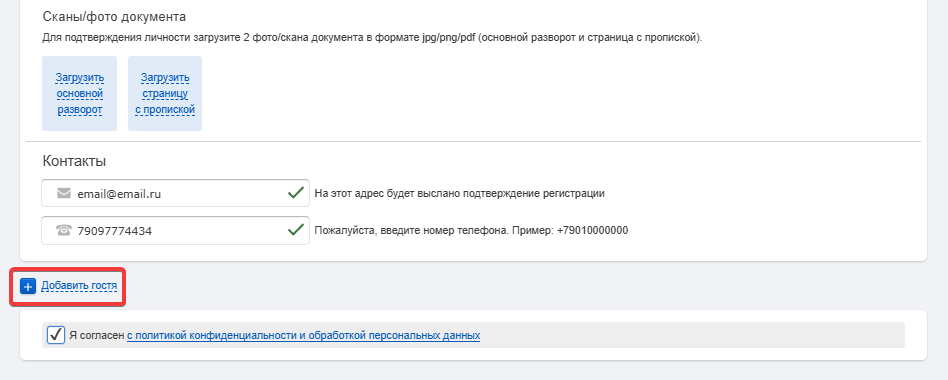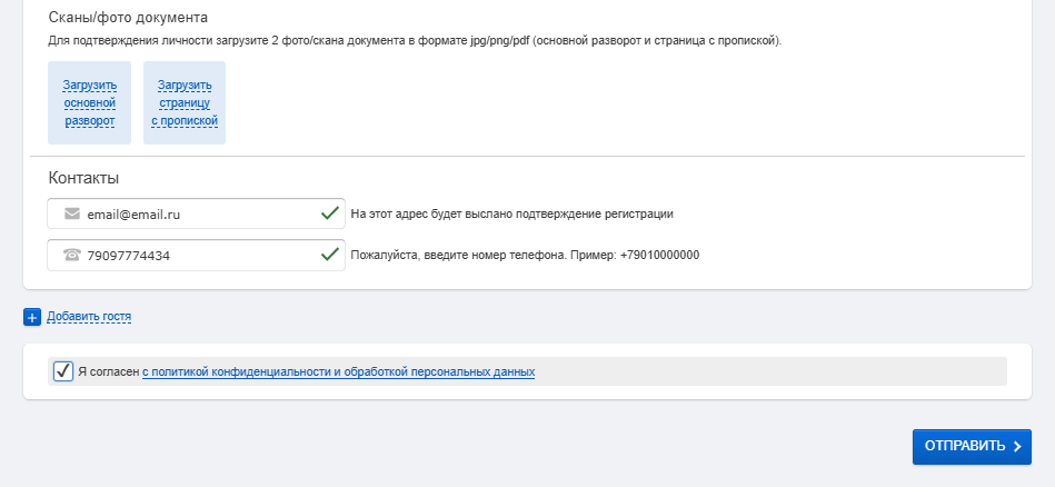 5. Гость проверяет свои данные, добавляет сканы или фото документа, подтверждает согласие с политикой конфиденциальности и обработкой персональных данных. Нажимает кнопку «Отправить» и завершает регистрацию.