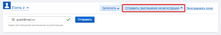 Гость, который совершил бронирование, может заполнить форму за другого гостя или отправить ему приглашение на регистрацию. Для этого необходимо указать email второго гостя и нажать кнопку «Отправить».