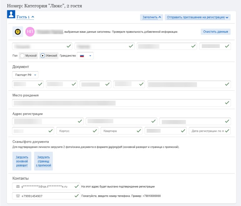4. После авторизации в карточке гостя автоматически заполнятся его персональные данные: