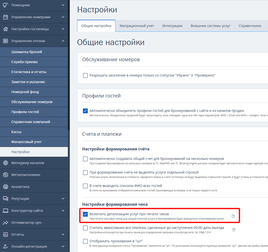 Если в разделе «Управление отелем» → «Настройки» → на вкладке «Общие настройки» в блоке «Настройки формирования чека» стоит галочка «Включить детализацию услуг при печати чеков», в чеке будет прописано «Проживание», а названия платных услуг и суммы будут напечатаны на чеке отдельными строками.