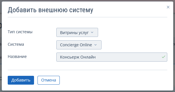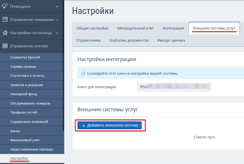 1. Перейдите в раздел «Управление отелем» → «Настройки» → вкладка «Внешние системы услуг». В блоке «Внешние системы услуг» нажмите кнопку «Добавить внешнюю систему».