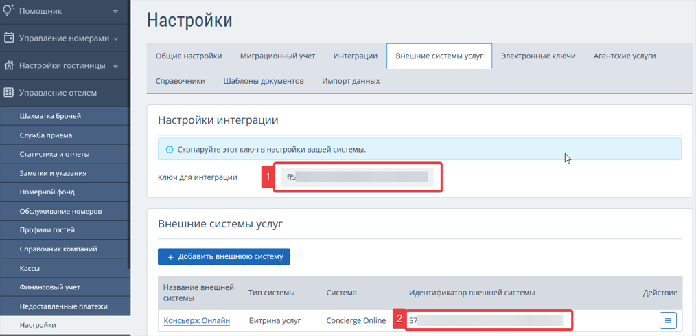 1. На странице «Управление отелем» → «Настройки» → на вкладке «Внешние системы услуг» скопируйте ключ для интеграции (1) и идентификатор внешней системы (2).