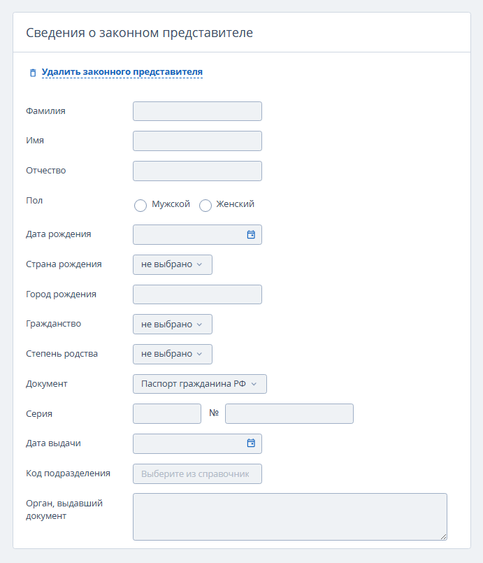 6. В блоке «Сведения о законном представителе» внесите данные представителя, если гость является несовершеннолетним, недееспособным или по другой причине действует через доверенное лицо.