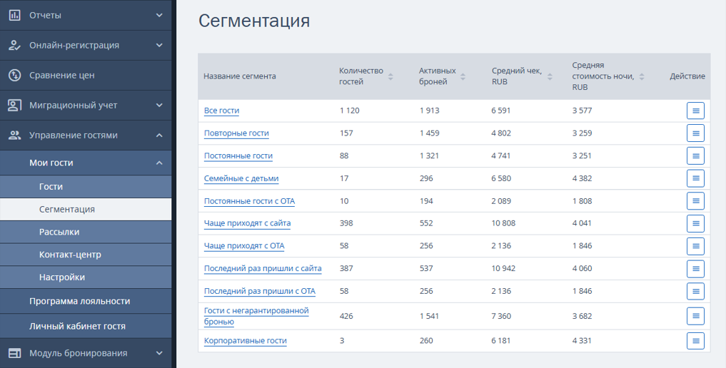 Общий список сегментов находится в разделе «Управление гостями» → «Мои гости» → «Сегментация».