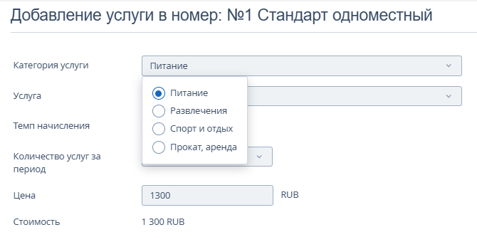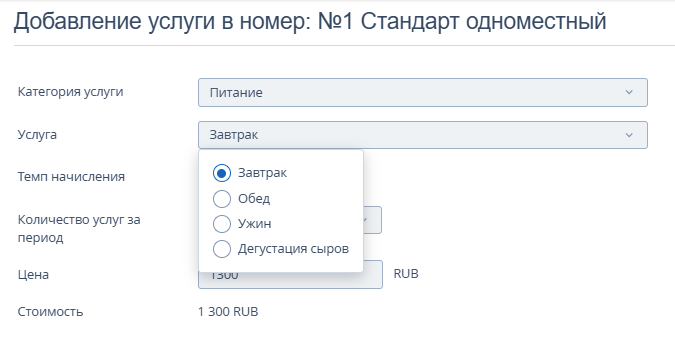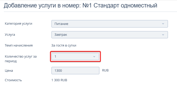 4. В открывшемся окне «Добавление услуги в номер: N» выберите:
