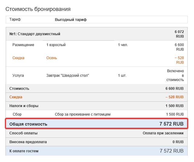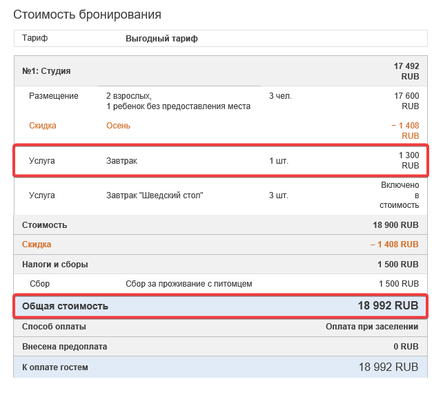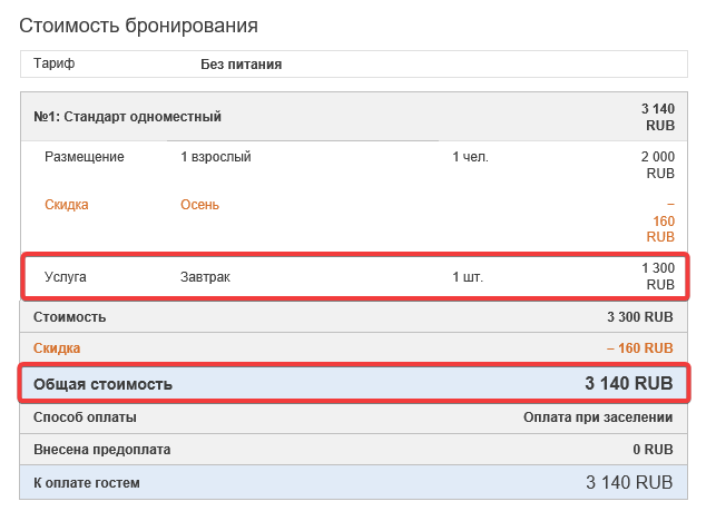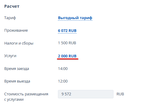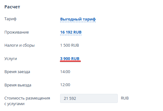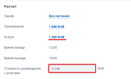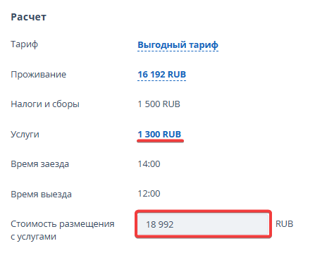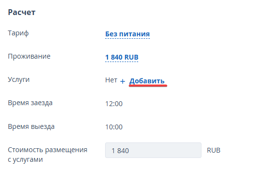 В блоке «Расчет» в пункте «Услуги» отобразится цена и стоимость размещения с услугами будет пересчитана.