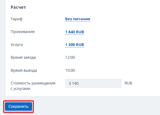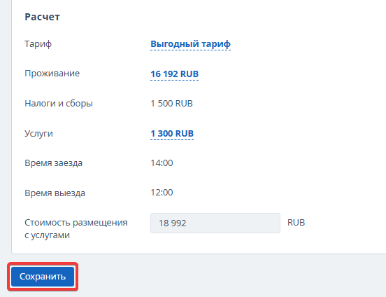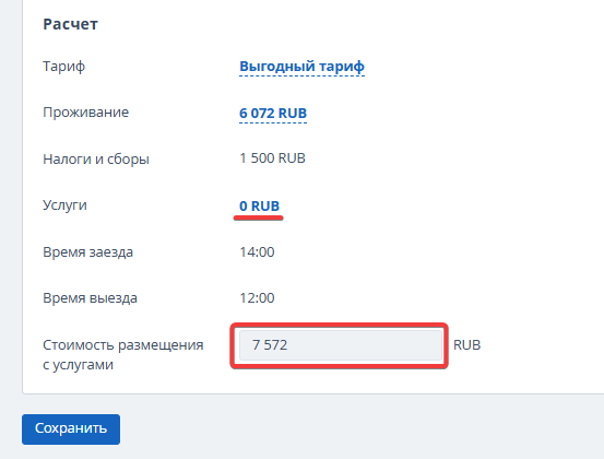В блоке «Расчет» в пункте «Услуги» отобразятся новые цена и стоимость размещения с услугами.
