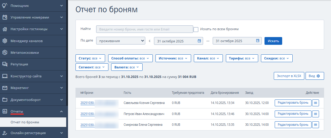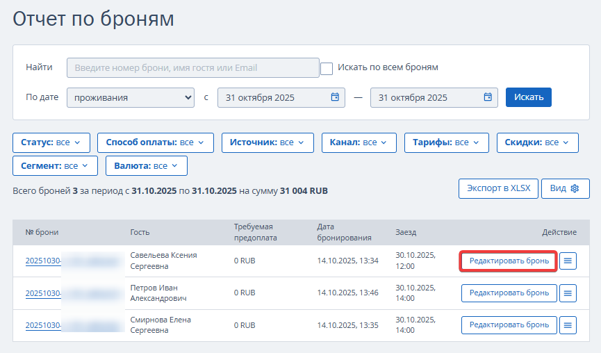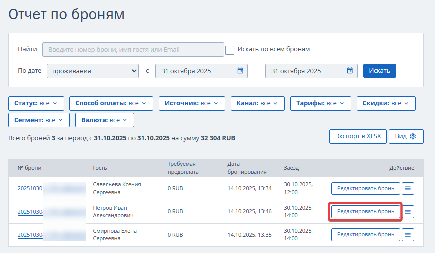 1. Найдите нужное бронирование, нажмите справа «Редактировать бронь» или «Действие» → «Редактировать».