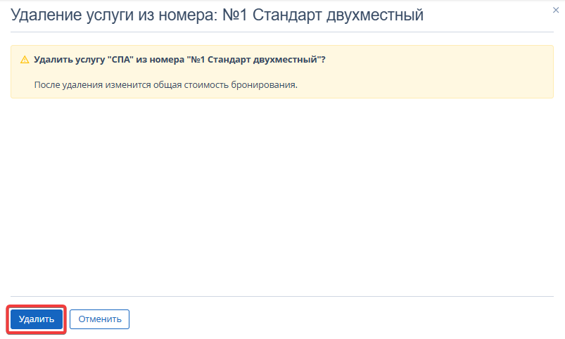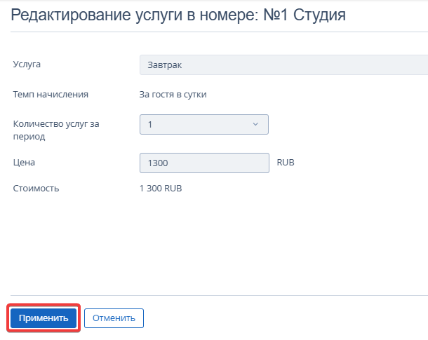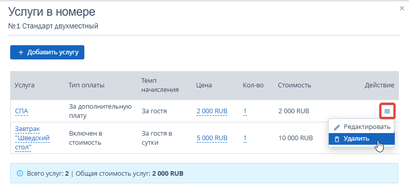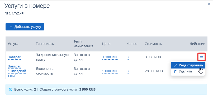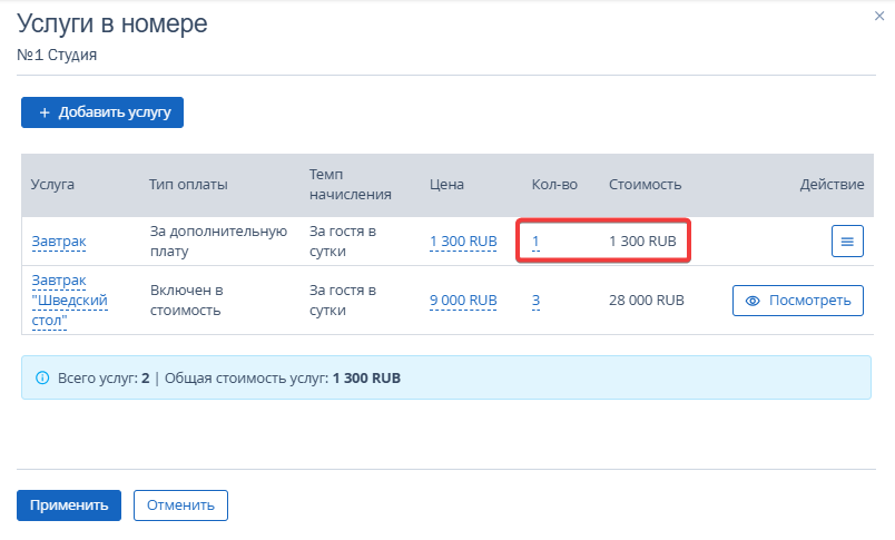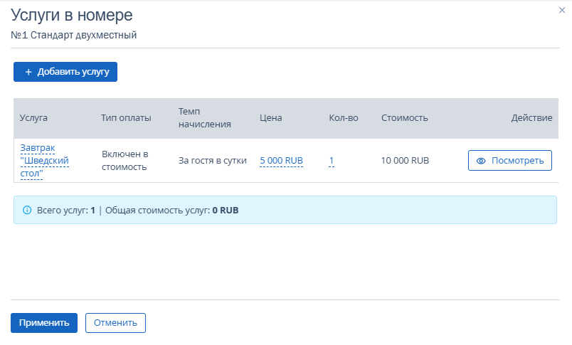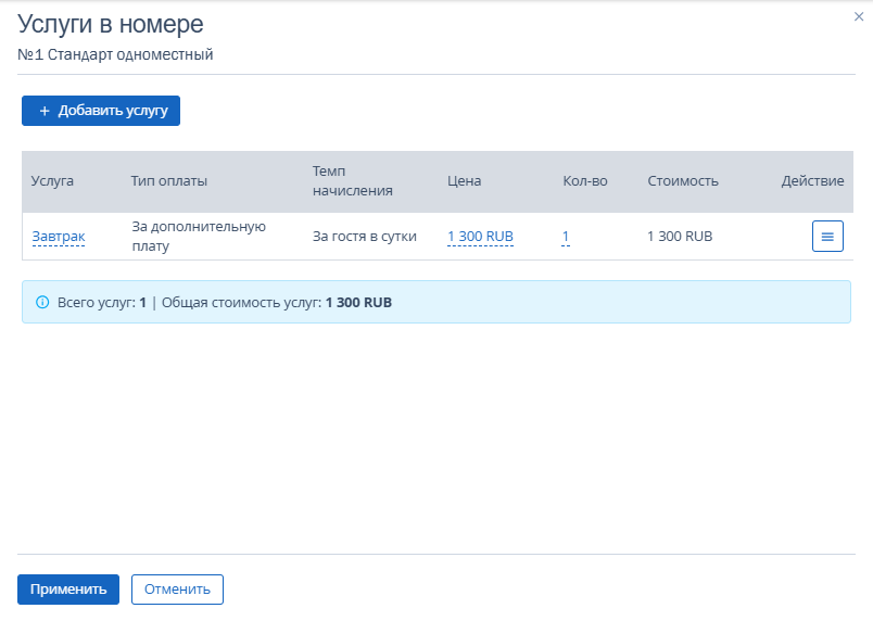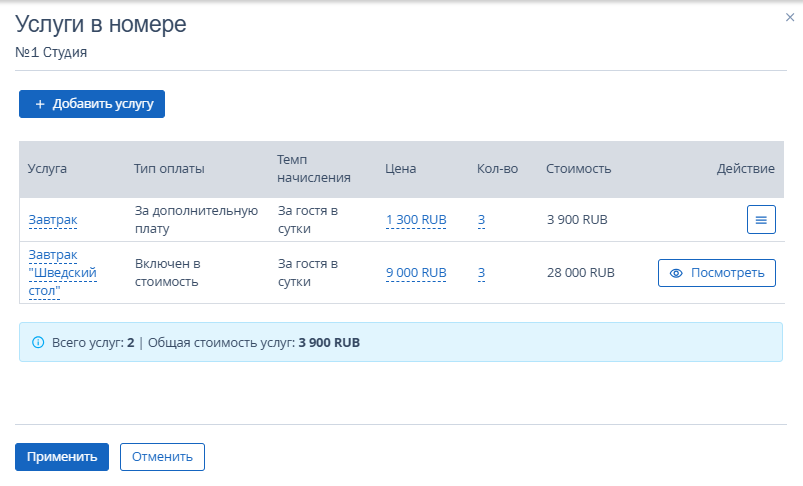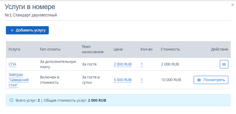 Добавленная услуга отобразится в списке «Услуги в номере».