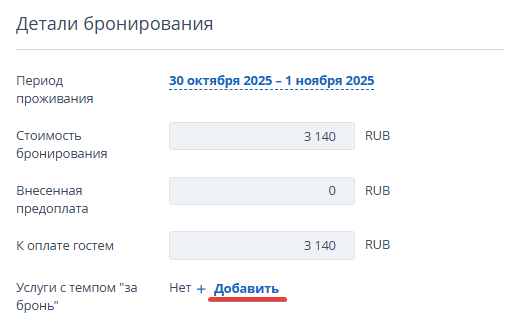 2. На странице бронирования в блоке «Расчет» → «Услуги» вы можете добавить услугу с любым темпом начисления, кроме «за бронь». Нажмите «Добавить».