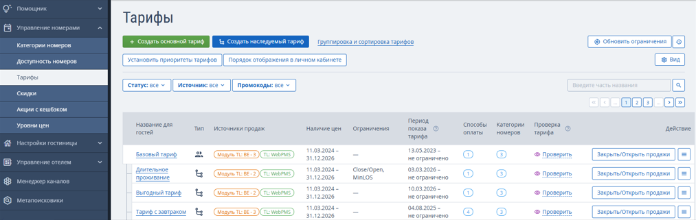 1. В личном кабинете TravelLine перейдите в раздел «Управление номерами» → «Тарифы».