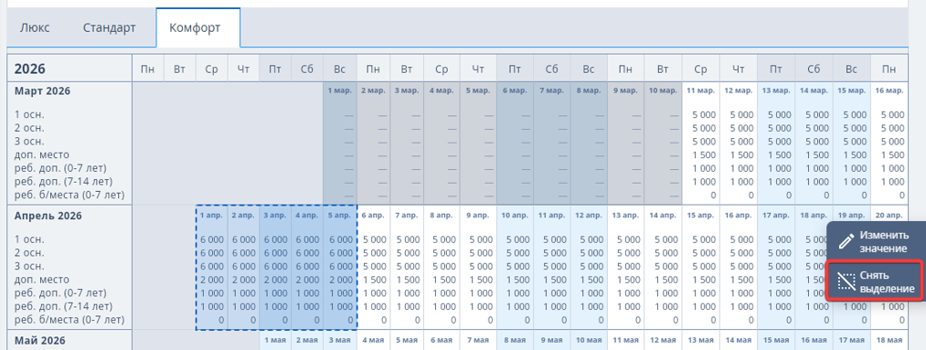 Цены изменены. Нажмите «Снять выделение», чтобы продолжить менять цены на другие даты.