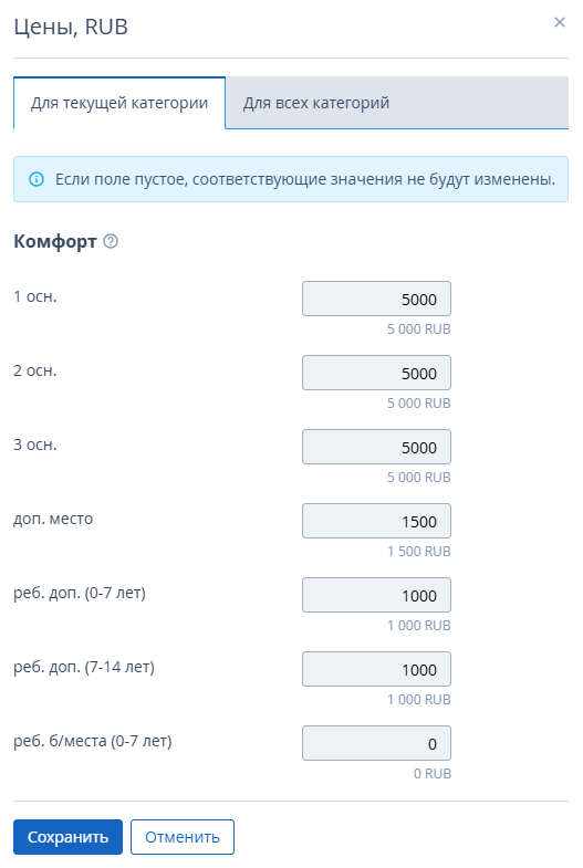 В строке «Доп.место» укажите отдельную стоимость дополнительного места, а также цены для размещения детей. Нажмите «Сохранить».