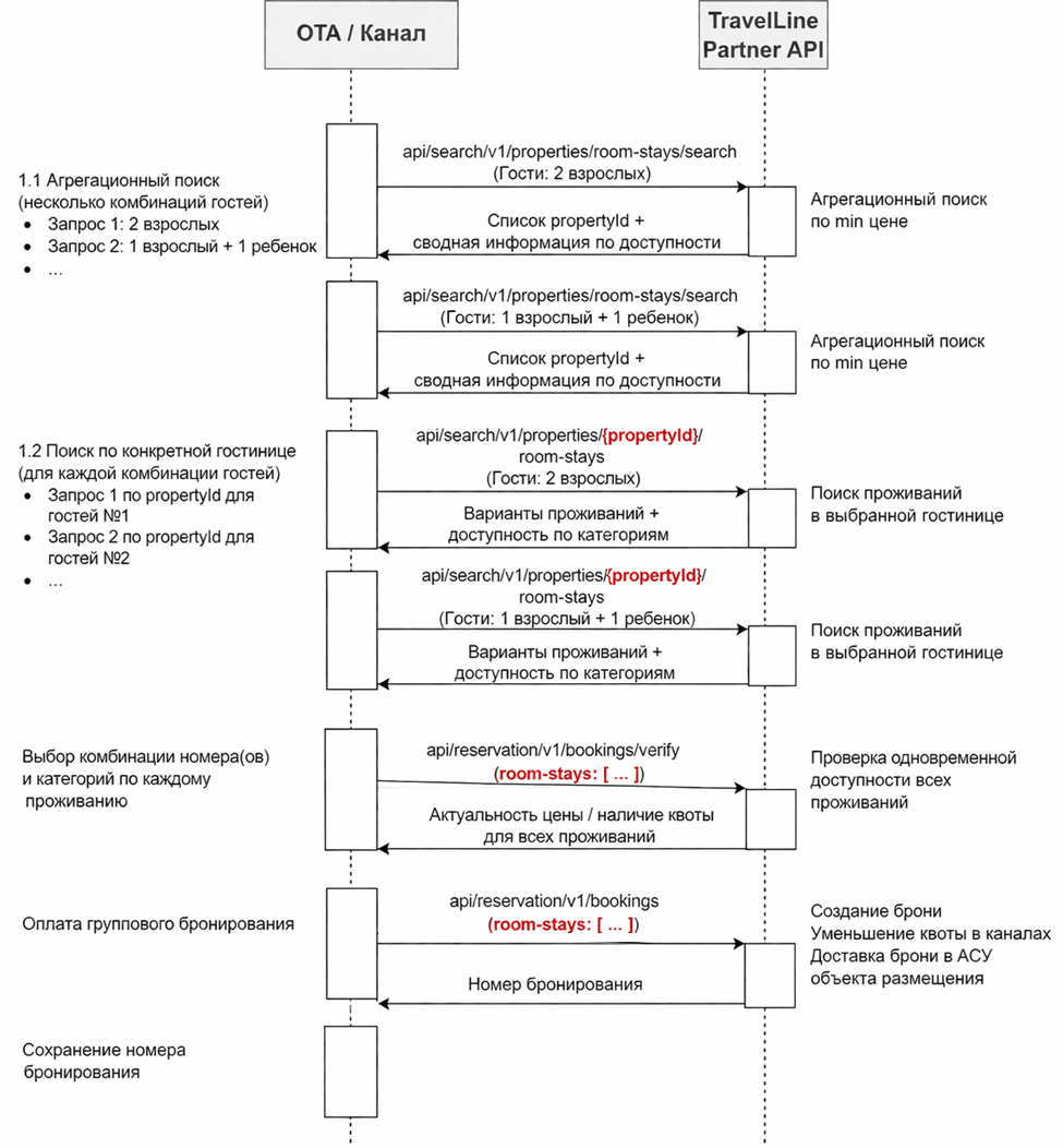 Канал направляет несколько запросов на агрегационный поиск или поиск по одному средству размещения в зависимости от состава группового бронирования. Например, первый запрос на 2 взрослых, второй запрос на 1 взрослого + 1 ребенка, и самостоятельно объединяет их в своем интерфейсе. Если состав гостей во всех номерах идентичен, направляется только один запрос.