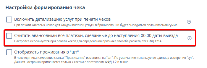 Печать чека на зачет аванса доступна только при наступлении момента оказания услуги. Момент оказания услуги настраивается в разделе «Управление отелем» → «Настройки» → «Настройки формирования чека»: