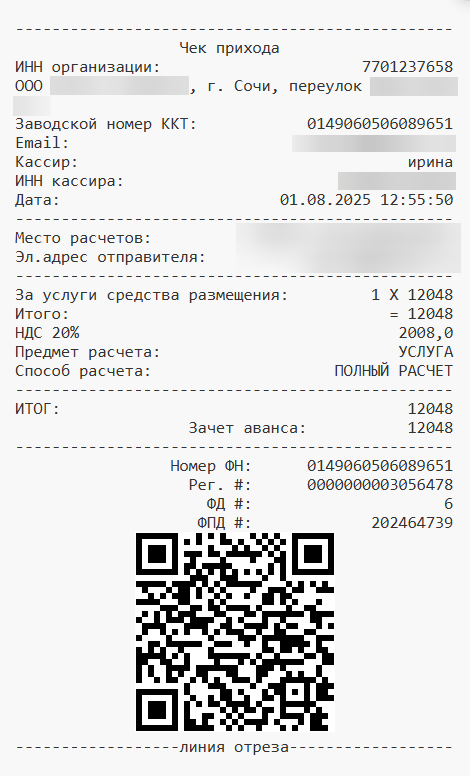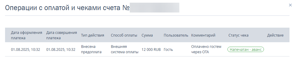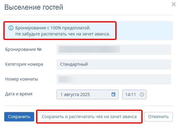 Чтобы выдать гостю чек, нажмите кнопку «Сохранить и распечатать чек на зачет аванса».