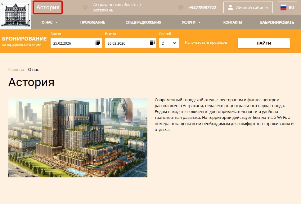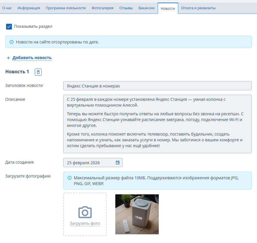 Данный раздел состоит из нескольких вкладок. Название раздела зависит от выбранного значения на первой вкладке: это может быть «О нас», «Об отеле», «О хостеле» и т. д.