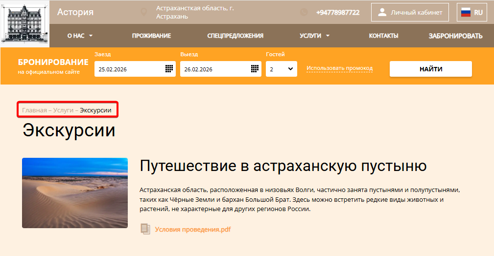 На страницах сайта (кроме главной) отображаются навигационные «хлебные крошки» — цепочка ссылок от главной страницы до текущего раздела.