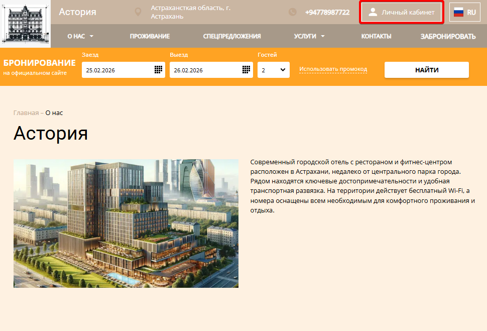 На сайте предусмотрена кнопка входа в личный кабинет гостя. Гость может войти в свой кабинет, чтобы воспользоваться преимуществами программы лояльности при бронировании. При необходимости кнопку можно отключить.