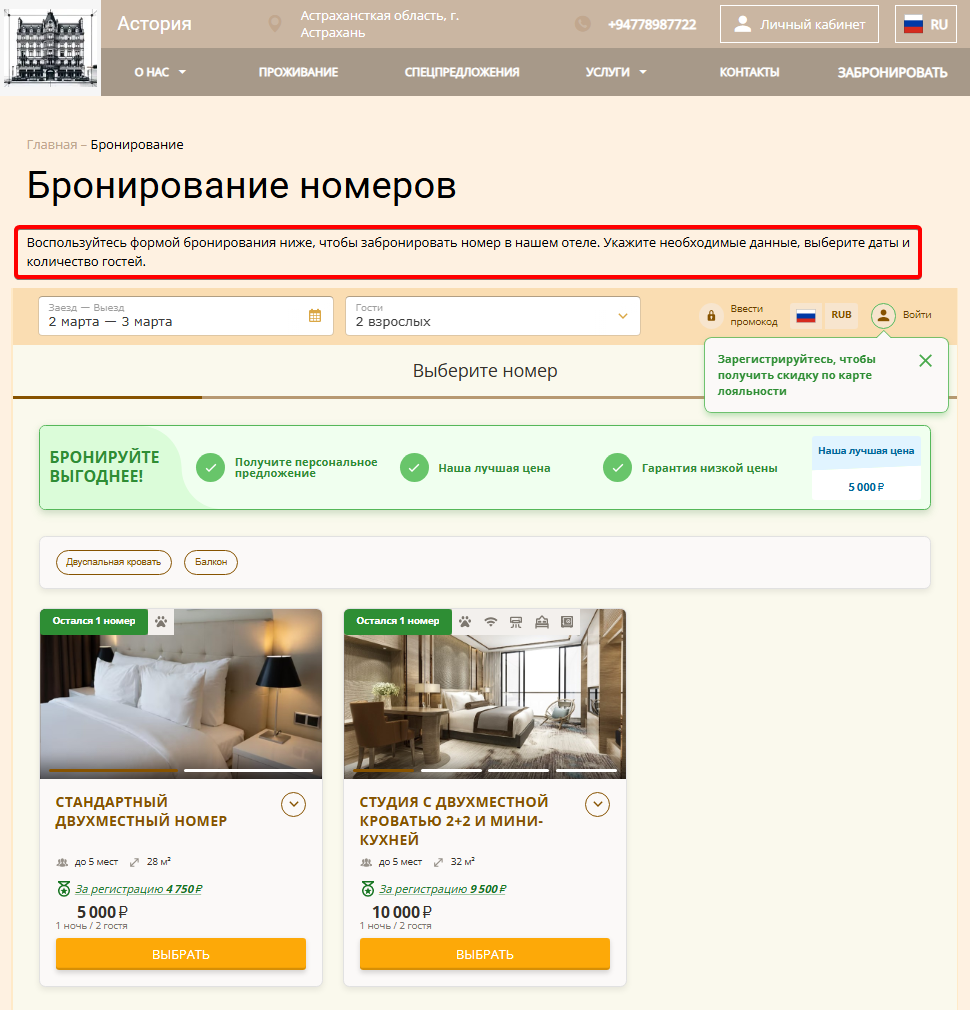 Добавьте текст, который появится в модуле бронирования над карточками номеров.