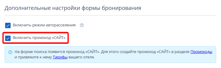 3. Если вы хотите предложить гостю тариф с льготными условиями проживания, доступный только на сайте, используйте промокод. Для этого создайте промокод «САЙТ» в разделе «Промокоды», привяжите его к тарифу в разделе «Тарифы». Затем в разделе «Управление контентом» → «Бронирование» отметьте галочкой пункт «Включить промокод "САЙТ"».