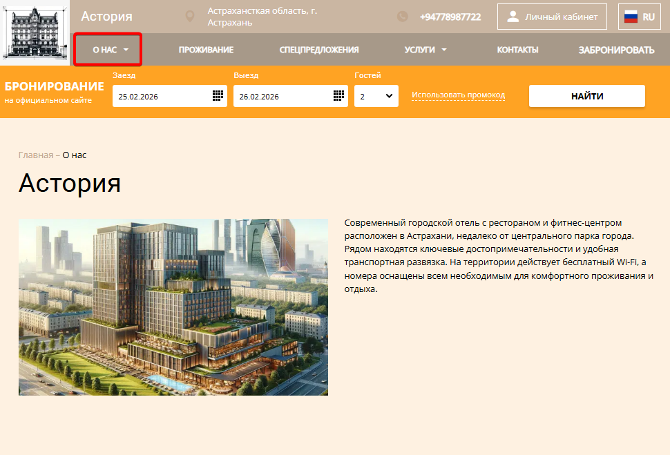 Выберите название страницы с информацией о средстве размещения, например, «О нас».