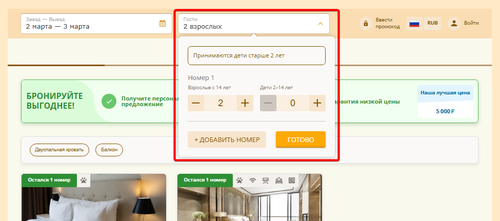 При режиме «Авторасселение» в модуле бронирования появится выбор количества гостей: взрослых и детей.