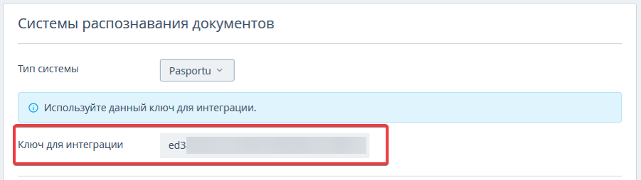 2. В этом же блоке найдите поле «Ключ для интеграции». Скопируйте его и передайте в службу поддержки Pasportu по телефону 8 812 244-69-29 или почте sales@pasportu.ru. Ключ интеграции нужен для обмена данными между TL: WebPMS и сервисом Pasportu.