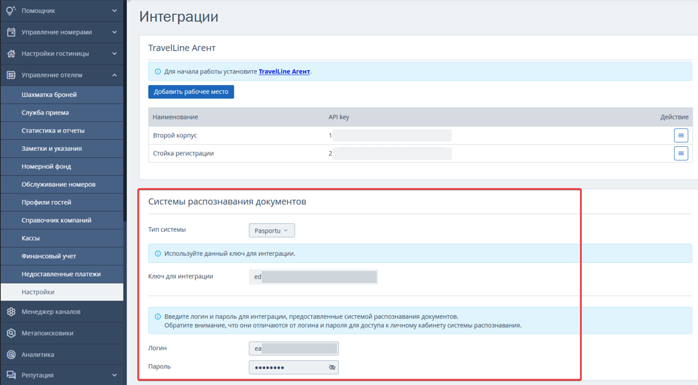 1. Перейдите в раздел «Управление отелем» → «Настройки» → вкладка «Интеграции» → блок «Системы распознавания документов».