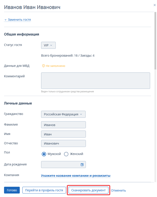В окне просмотра информации о госте тоже появится кнопка «Сканировать документ».