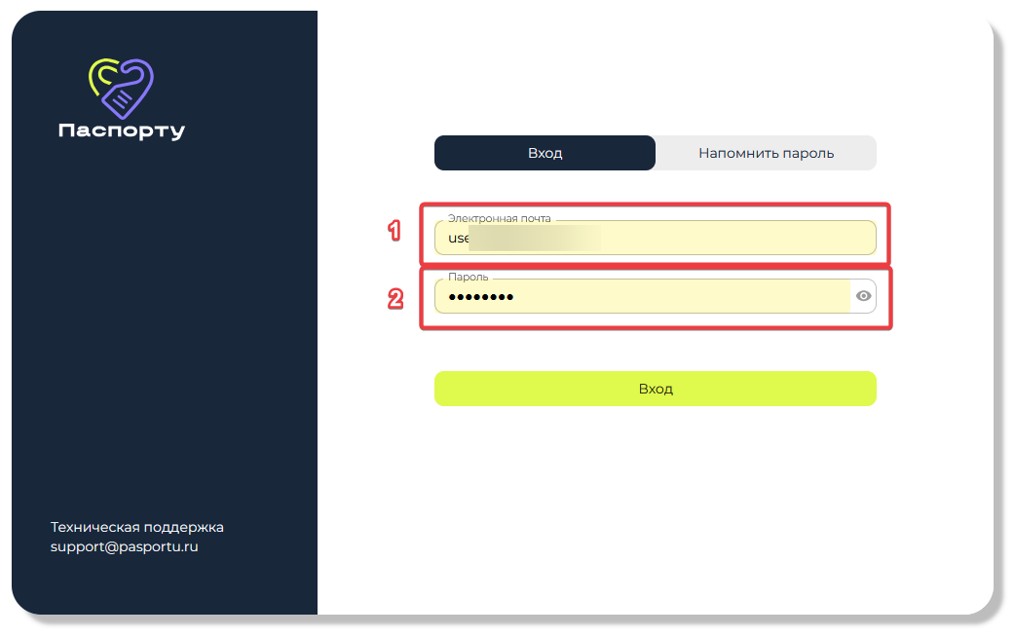 При первой авторизации в сервисе надо указать электронную почту (1) и пароль (2) от личного кабинета Pasportu.