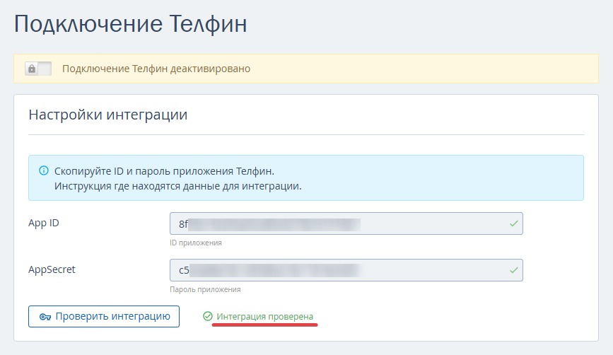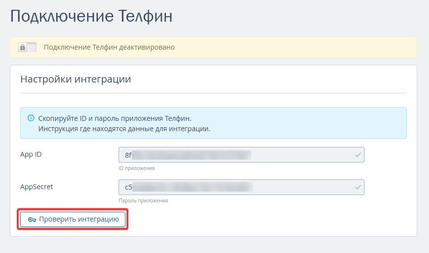 2. На странице «Подключение Телфин» в блоке «Настройки интеграции» скопируйте ID и пароль приложения «Телфин» и добавьте в соответствующие поля App ID (ID приложения) и AppSecret (пароль приложения).
