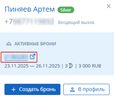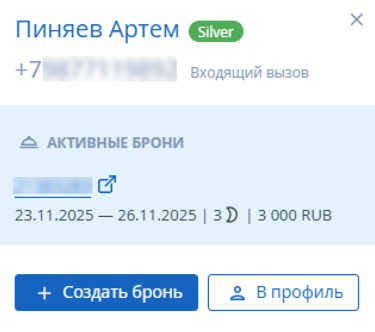 При входящем звонке сотрудник, принимающий звонок, в личном кабинете TravelLine увидит карточку гостя во всплывающем окне. При этом у сотрудника не обязательно должна быть открыта страница «Контакт-центр», всплывающее окно будет отображаться во всех разделах личного кабинета. Карточка гостя отобразится в правом верхнем углу экрана.