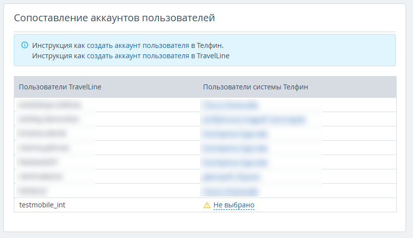 Обратите внимание. На одного пользователя системы «Телфин можно сопоставить несколько пользователей TravelLine.