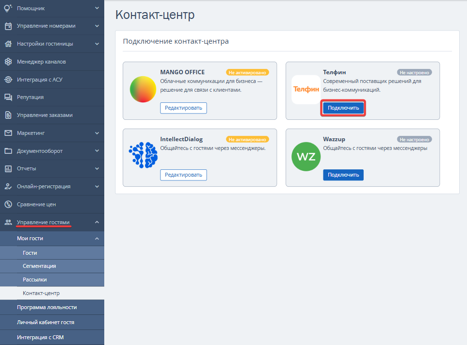 1. Перейдите в раздел «Управление гостями» → «Мои гости» → «Контакт-центр». В блоке «Подключение контакт-центра» выберите «Телфин» и нажмите кнопку «Подключить».