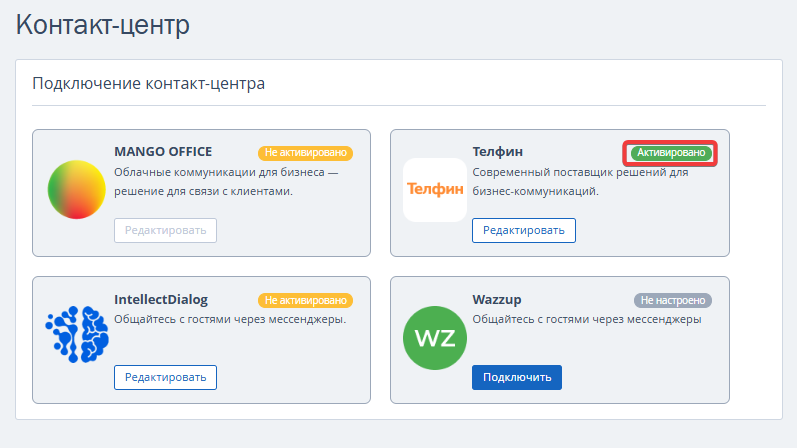 На странице «Контакт-центр» карточка интеграция будет с метой «Активировано».