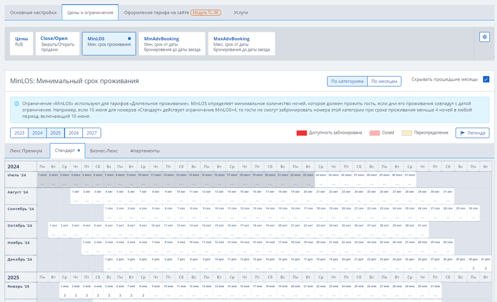 4. Настройте MinLOS (минимальный срок проживания, далее — MinLOS). Например, гости могут воспользоваться спецпредложением только при длительности проживания от трех ночей — при настройке MinLOS выделите праздничные даты и укажите 3.