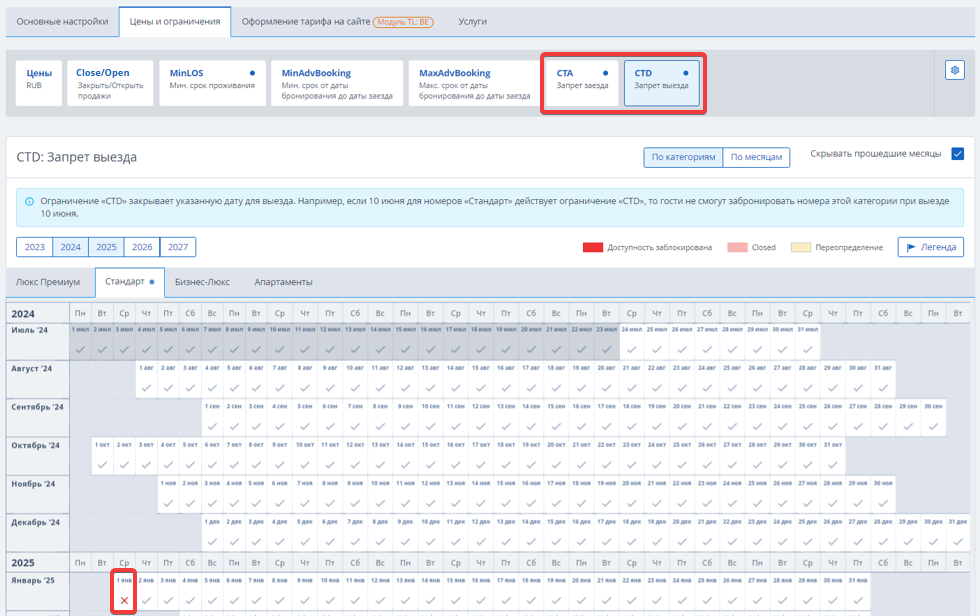 6. Настройте ограничения CTA и CTD на 1 января, так как в этот день заезды и выезды не планируются.