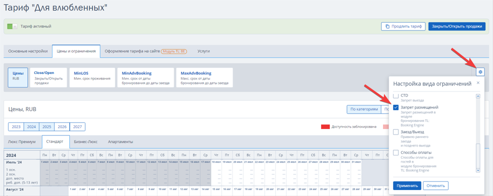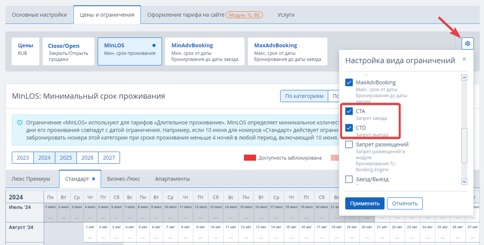 5. Для того, чтобы запретить заезд и выезд из отеля на определенные даты, через кнопку «Настройка вида ограничений» добавьте ограничения CTA (запрет заезда, далее — CTA) и CTD (запрет выезда, далее — CTD).