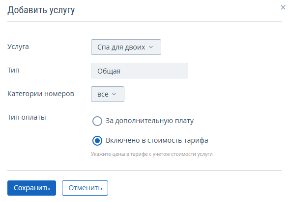 7. В разделе «Управление номерами» → «Тарифы» → тариф «Для влюбленных» на вкладке «Услуги» добавьте услугу «Спа для двоих».