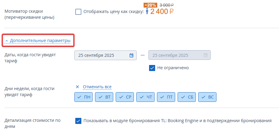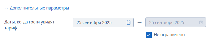 Обратите внимание: «Даты, когда гости увидят тариф» — это не период его действия. Чтобы настроить период действия тарифа, используйте ограничение Closed. Подробнее: «Как закрыть продажи по тарифу».