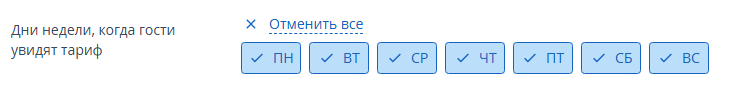 4. Если тариф должен отображаться в определенные дни недели, в пункте «Дни недели, когда гости увидят тариф» снимите галочки с дней, когда тариф не должен отображаться на модуле онлайн-бронирования.