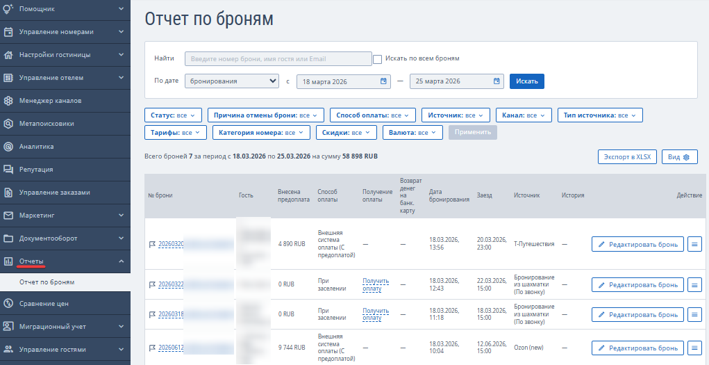 1. В личном кабинете TravelLine перейдите в раздел «Отчеты» → «Отчет по броням».