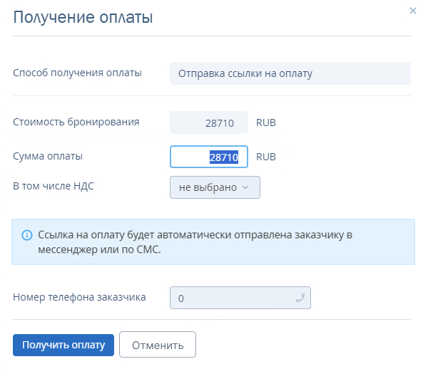 Откроется окно, где необходимо внести информацию об оплате. Вы можете уменьшить сумму оплаты. Увеличить число на большее, чем стоимость бронирования, нельзя.