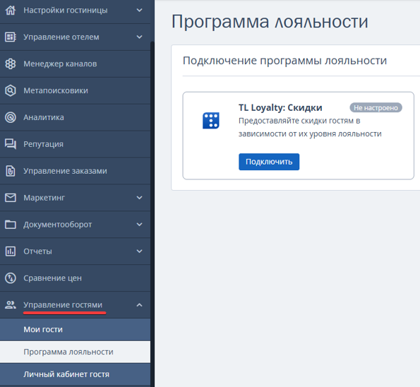Чтобы активировать программу лояльности, перейдите в раздел «Управление гостями» → «Программа лояльности» → «Подключить».