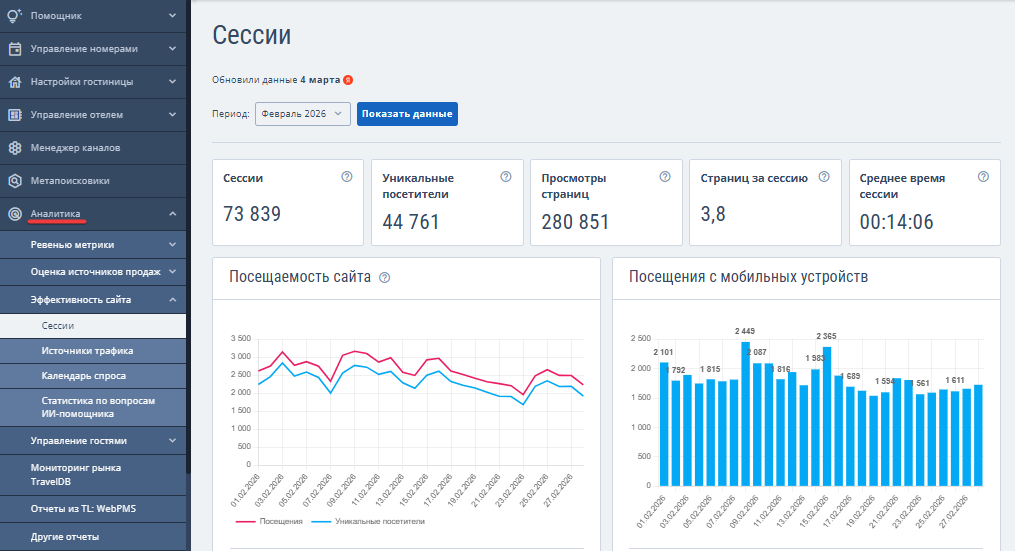 1. В личном кабинете TravelLine перейдите в раздел «Аналитика» → «Эффективность сайта» → «Сессии».