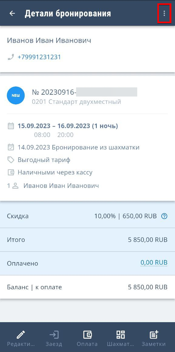 1. Перейдите в бронирование → на странице «Детали бронирования» нажмите кнопку «Действие» с тремя точками в правом верхнем углу экрана.