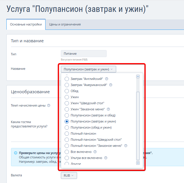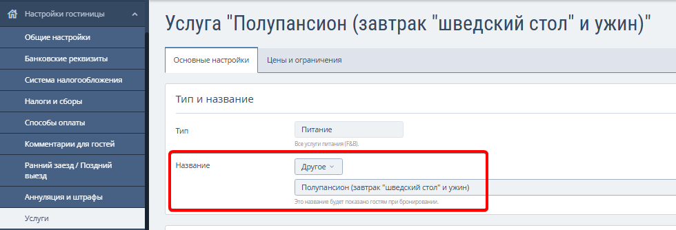 Как правильно: выберите максимально подходящее название из справочника — например, «Полупансион», а детали уточните в описании. Проверьте, что эта услуга привязана к тарифу в разделе «Управление номерами» → «Тарифы» → в тарифе вкладка «Услуги».
